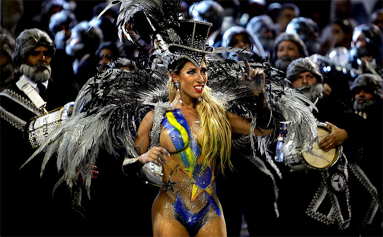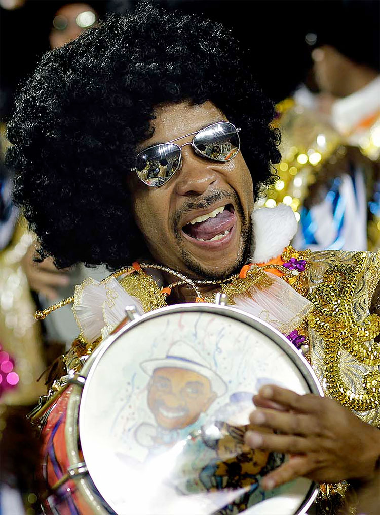 A drummer performs with the Aguia de Ouro samba school, and a dancer performs during the parade by members of the Dragoes da Real samba school in Sao Paulo . (Andre Penner/Associated Press)