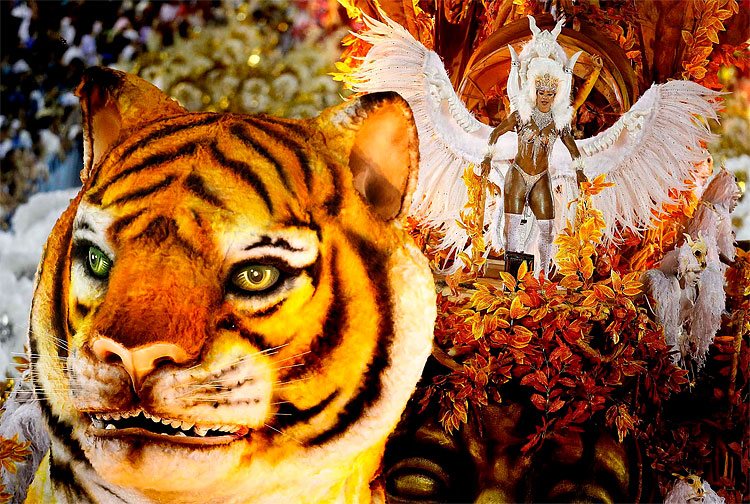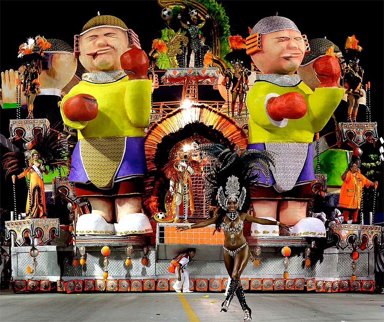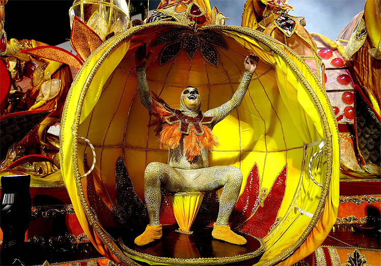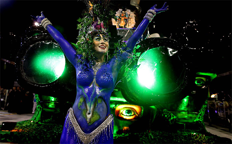 Dancers perform on a float during the parade of the Mancha Verde samba school in Sao Paulo . (Andre Penner/Associated Press)