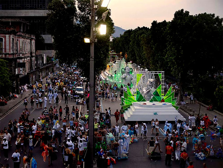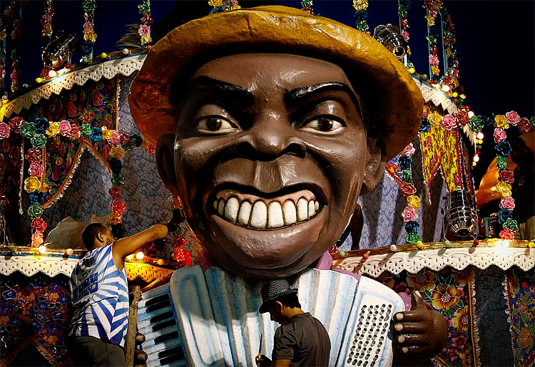Workers put the finishing touches on the Portela samba school float, and it and other floats make their way to the Sambadrome in Rio de Janeiro on Sunday. (Victor R. Caivano/Associated Press)