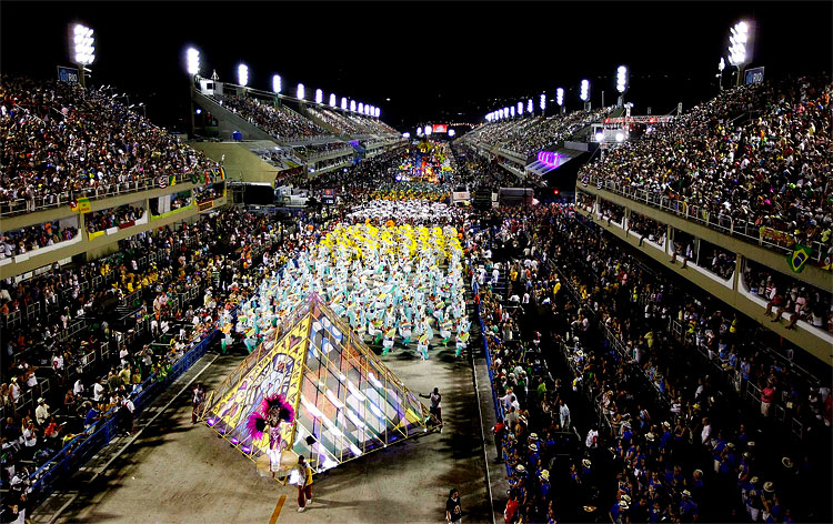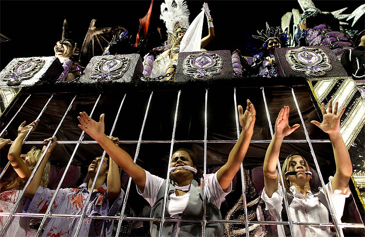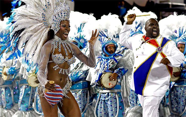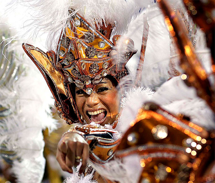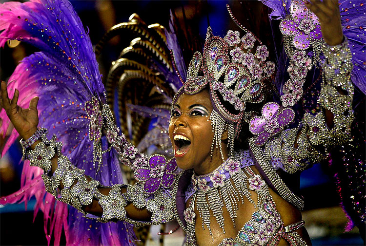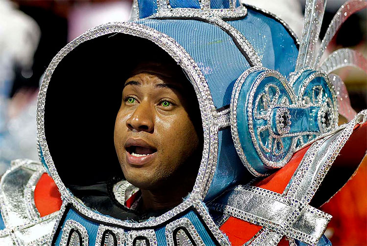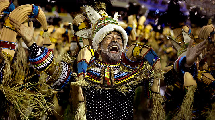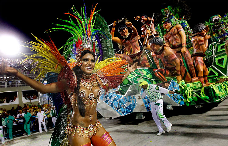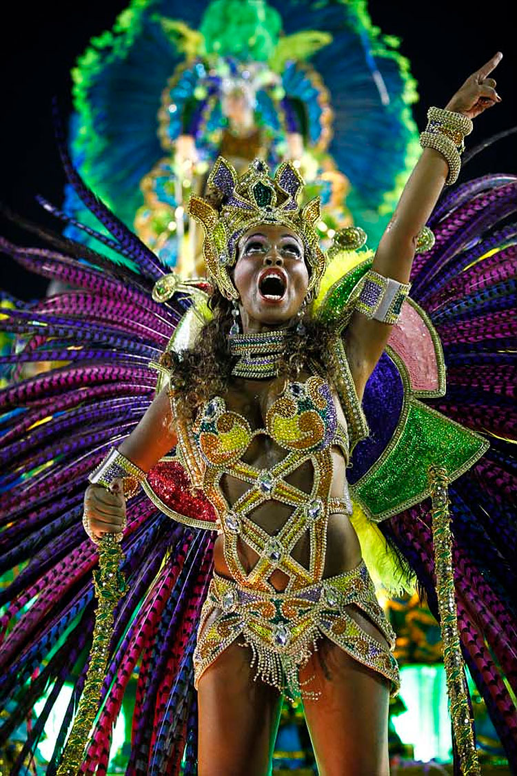 Performers from the Mocidade Independente de Padre Miguel samba school join in the celebrations at the Sambadrome in Rio de Janeiro . (Silvia Izquierdo/Associated Press)