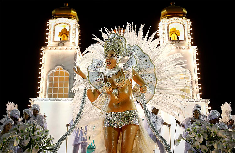 A dancer performs during the Carnival parade of the Camisa Verde e Branco samba school in Sao Paulo . (Andre Penner/Associated Press)