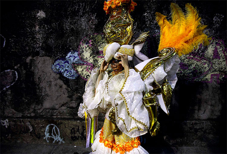 A reveler puts on her costume to parade with the Portela samba school at the Sambadrome in Rio de Janeiro . (Victor R. Caivano/Associated Press)