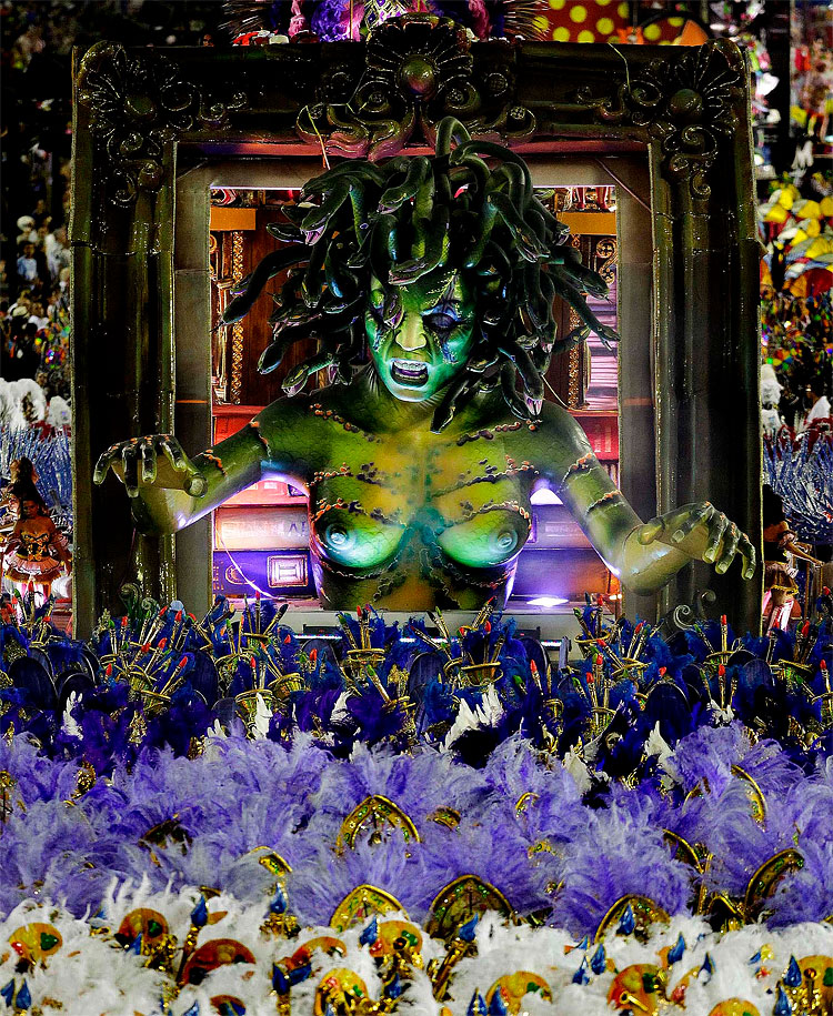 Dancers from the Renascer de Jacarepagua samba school perform on a float during the parade at the Sambadrome in Rio de Janeiro . (Felipe Dana/Associated Press)