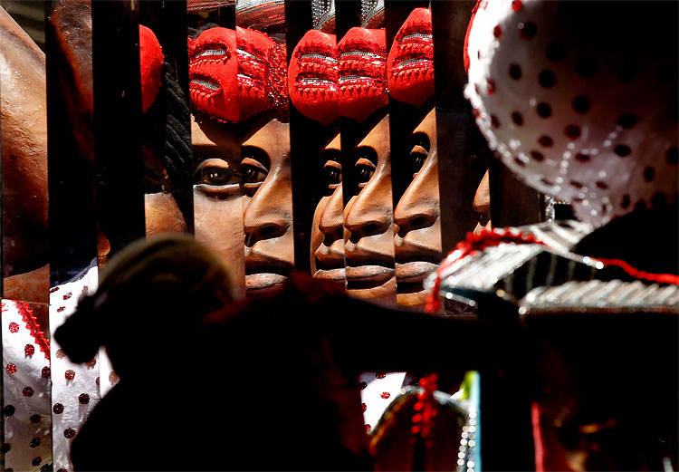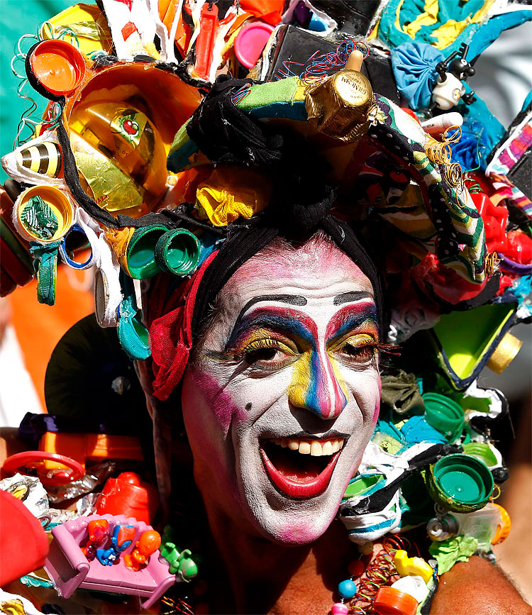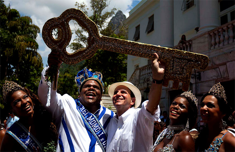 The mythical jester figure who reigns over Carnival, this year’s King Momo, the crowned and costumed Milton Junior and Rio de Janeiro’s Mayor Eduardo Paes hold up the key to the city at the official ceremony kicking off the five-day bash in Rio de Janeiro. Merrymakers are expected to spend $640 million and generate 250,000 jobs, according to the city’s economic development department. (Felipe Dana/Associated Press)