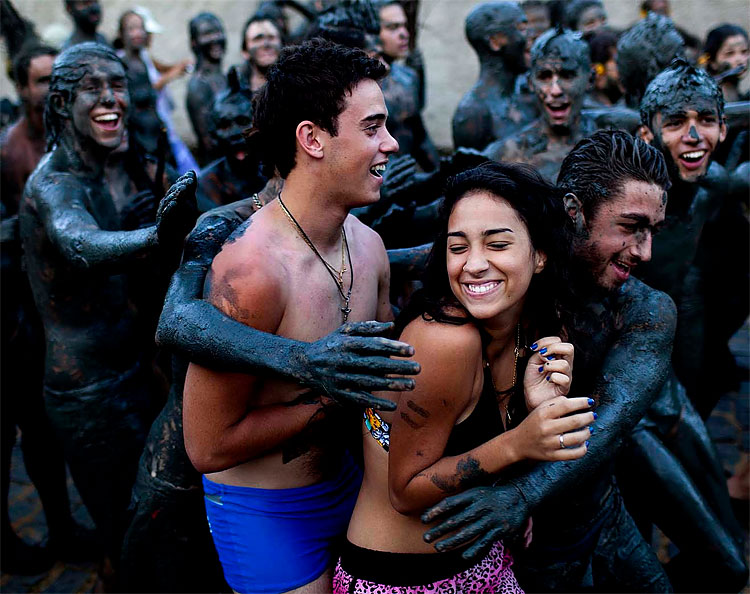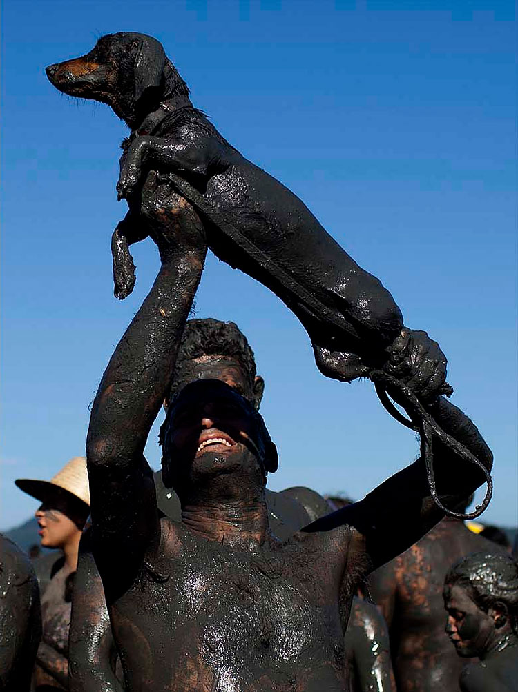 Mud-covered revelers hug tourists, and a man holds up his dog during the “Bloco da Lama,” or “Mud Block” parade in Parati. (Felipe Dana/Associated Press)
