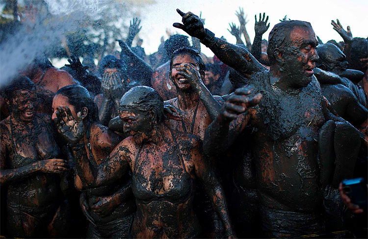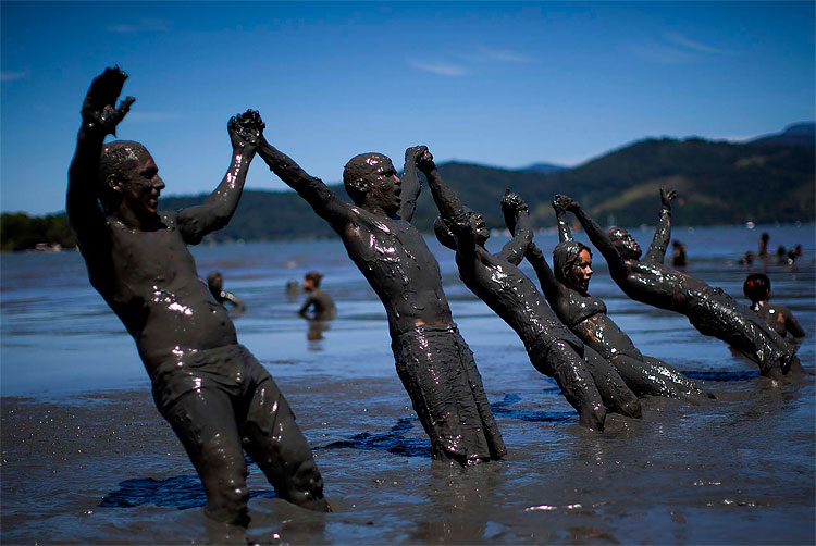Revelers hold hands as they fall into the mud during the “Bloco da Lama” parade in Parati. (Felipe Dana/Associated Press)