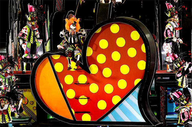 A dancer, left, and Brazilian pop artist Romero Britto perform with the Renascer de Jacarepagua samba school parade at the Sambadrome in Rio de Janeiro . (Associated Press)