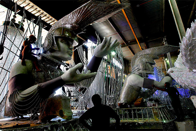 Workers prepare a carnival float at the Mocidade Independente de Padre Miguel samba school in Rio . (Silvia Izquierdo/Associated Press)